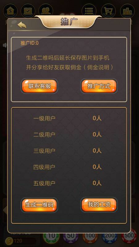 每个玩家带有自己专属推广二维码,发展下级,支持六级、带工资功能。