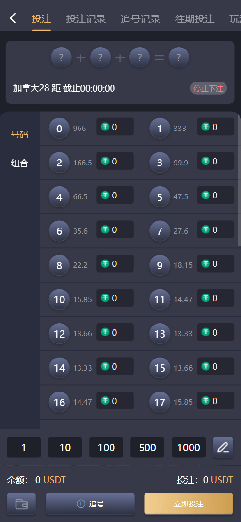USDT下注、游戏赔率、游戏规则、投注记录、盈利统计、利率追号、同倍追号、翻倍追号、追号期数、生成追号计划、号码组合、前端vue、后端Java